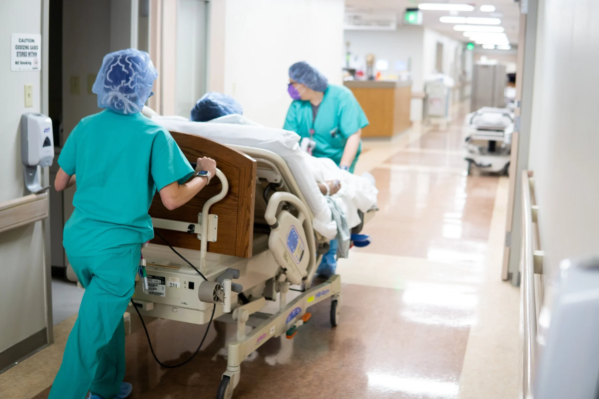 It was early morning when it was finally time. She was dilated to a 9 and it was time to move to the OR. Because it wasn’t a C-section, Cory and I were not required to wear the full gown, and instead just had to wear a cap and booties! Kristoin was wheeled off, and we joined her in the OR shortly after